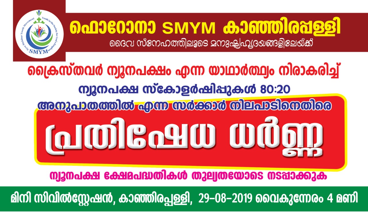 ന്യൂനപക്ഷ സ്കോളർഷിപ്പുകൾ 80:20 അനുപാതത്തിൽ എന്ന സർക്കാർ നിലപാടിനെതിരെ നാളെ വൈകുന്നേരം 4 മണിയ്ക്ക് കാഞ്ഞിരപ്പള്ളിയിലും, പൊൻകുന്നത്തും, കട്ടപ്പനയിലും സർക്കാർ സ്ഥാപനങ്ങൾക്ക് മുൻപിൽ കാഞ്ഞിരപ്പള്ളി രൂപതയിലെ വിവിധ…