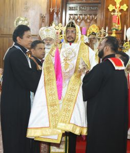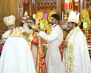 പ്രസംഗത്തിനുശേഷം നിയുക്ത മെത്രാൻ സഭയുടെ വിശ്വാസപ്രമാണവും സത്യപ്രതിജ്ഞയും വിശ്വാസികളെ സാക്ഷ്യനിർത്തി ഏറ്റുപറഞ്ഞു. തുടർന്ന് കാർമ്മികർ നിയുക്ത മെത്രാനെ ആശീർവദിച്ചു. തുടർന്നു നിയുക്ത മെത്രാൻ ത്രോണോസിന്റെ മുൻപിൽ മുട്ടിൻമേൽ നിന്നു. അപ്പോൾ പ്രധാന കാർമികൻ തന്റെ കാപ്പകൊണ്ട് അദ്ദേഹത്തെ മറച്ച് വി. കുർബാനയിന്മേൽ കൈകൾ ആവസിപ്പിച്ചു ആദ്ദേഹത്തിന്റെ ശിരസ്സിൽ മൂന്നുപ്രാവശ്യം വച്ചു. ഈ സമയം സഹകാർമികർ വി. സുവിശേഷം അദ്ദേഹത്തിന്റെ ശിരസ്സിനു മുകളിൽ പിടിച്ചുകൊണ്ടു നിൽക്കുകയും പ്രാർത്ഥിക്കുകയും ചെയ്തു. തുടർന്ന് നിയുക്ത മെത്രാനു ഗീവർഗീസ് മാർ അപ്രേം എന്ന പുതിയ നാമം നല്കി അദ്ദേഹത്തെ എപ്പിസ്കോപ്പാ ആയി ഉയർത്തി. തുടർന്ന് എപ്പിസ്കോപ്പായുടെ സ്ഥാനവസ്ത്രങ്ങൾ ധരിപ്പിച്ച് കുരിശുമാല അണിയിച്ച് അജപാലനത്തിന്റെ അധികാരചിഹ്നമായ സ്ലീബാ കൈയിൽ കൊടുത്തു. അദ്ദേഹത്തെ സിംഹാസനത്തിൽ ഇരുത്തി ഇവൻ യോഗ്യനാകുന്നു എന്ന അർത്ഥമുള്ള ‘ഓക്സിയോസ്’ മൂന്നുപ്രാവശ്യം ചൊല്ലി മേല്പോട്ടു ഉയർത്തി. ഈ സമയം അഭിഷിക്തനായ മെത്രാൻ കൈക്കുരിശ് ഉയർത്തി വിശ്വാസികളെ ആശീർവദിച്ചു. അതിനുശേഷം അദ്ദേഹം സിംഹാസനത്തിൽ ഇരുന്നുകൊണ്ടുതന്നെ ഞാൻ നല്ല ഇടയനാകുന്നു എന്ന സുവിശേഷഭാഗം വായിച്ചു. തുടർന്നു ലുത്തിനിയ പ്രാർത്ഥന ചൊല്ലി.