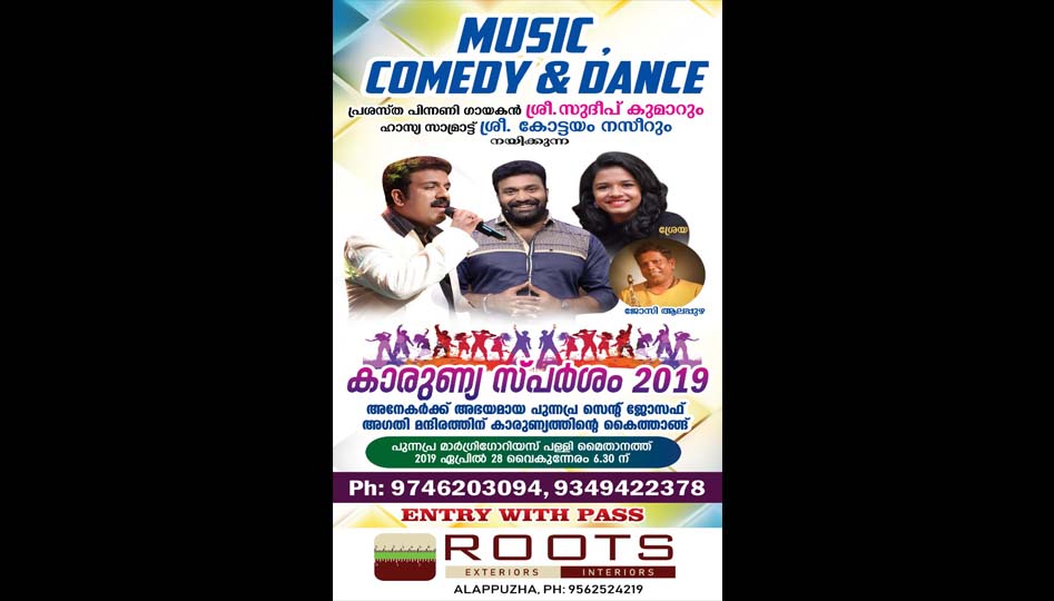 1935 ൽ സ്ഥാപിതമായ പുന്നപ്ര സെന്റ്‌ ജോസഫ്സ്‌ പുവർ ഹോമിനെ കാലാനുസ്യതമായി, മെച്ചപ്പെട്ട സൗകര്യങ്ങളോടെ നവീകരിക്കുന്നതിന്റെ ഭാഗമായി സംഘടിപ്പിക്കുന്ന കാരുണ്യസ്പർശം 2019 ഏപ്രിൽ 28 ഞായറാഴ്ച വൈകിട്ട്‌…